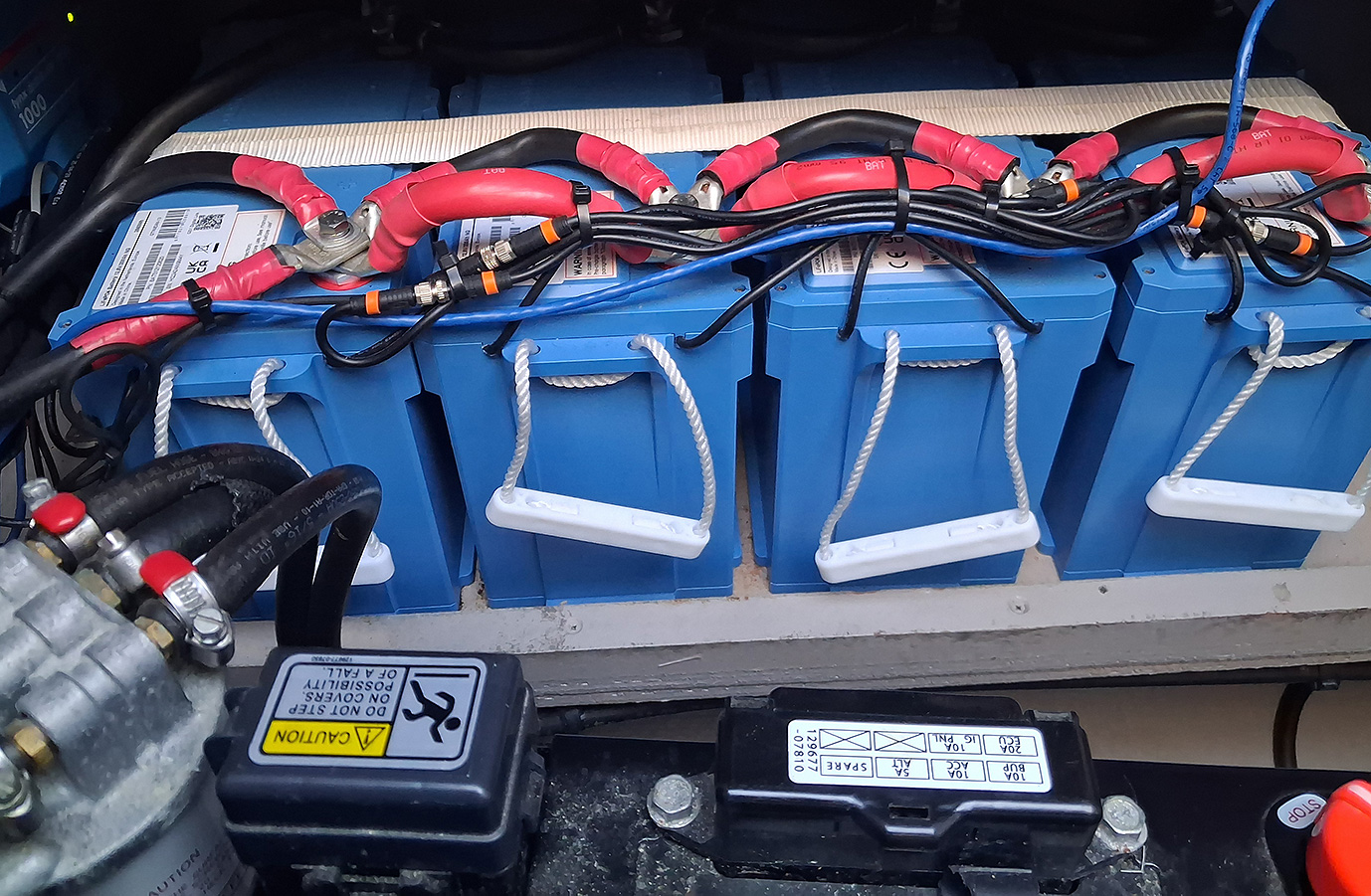 Montaje profesional con Victron Energy, baterías de litio, cableado marino y protección adecuada. -